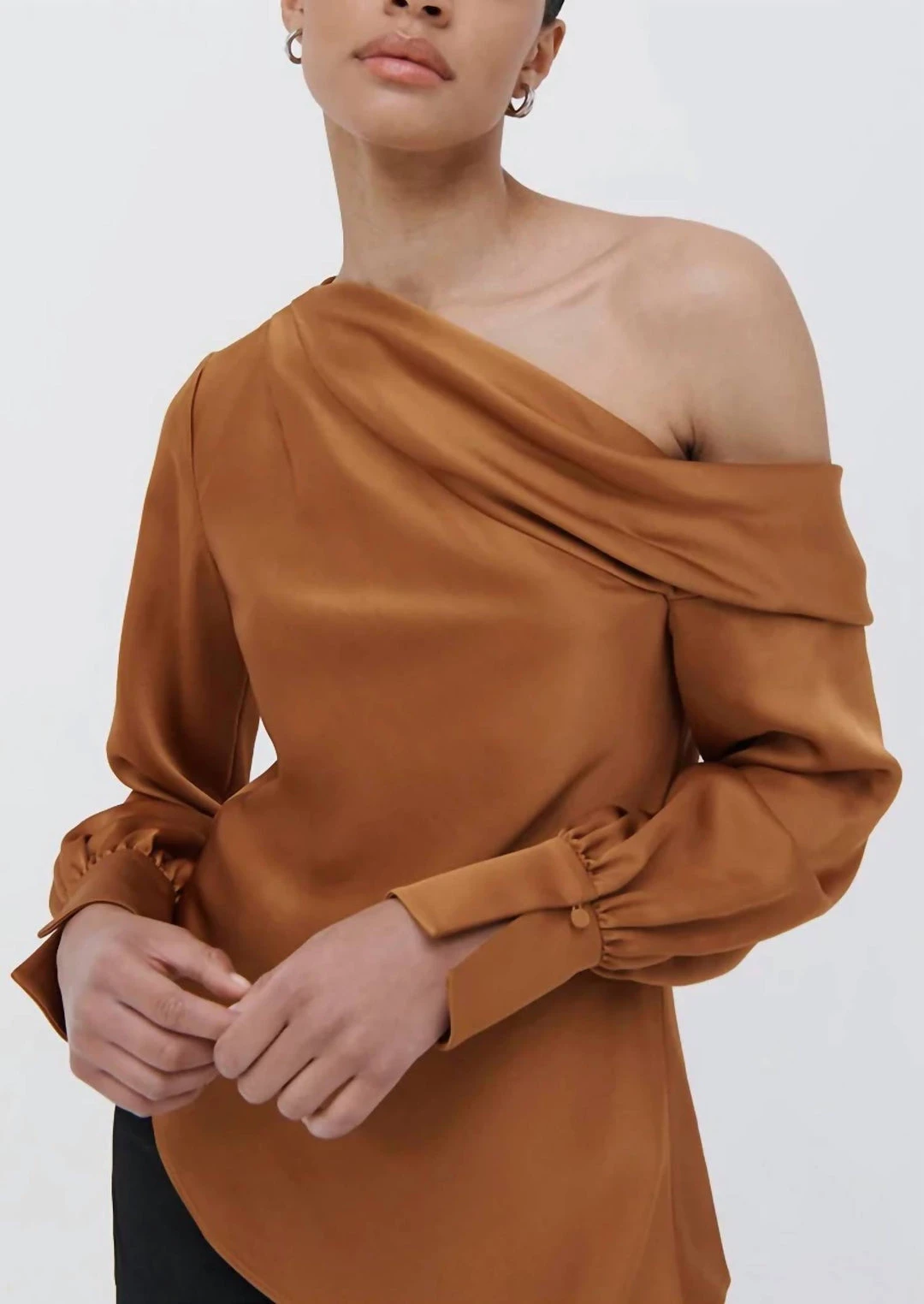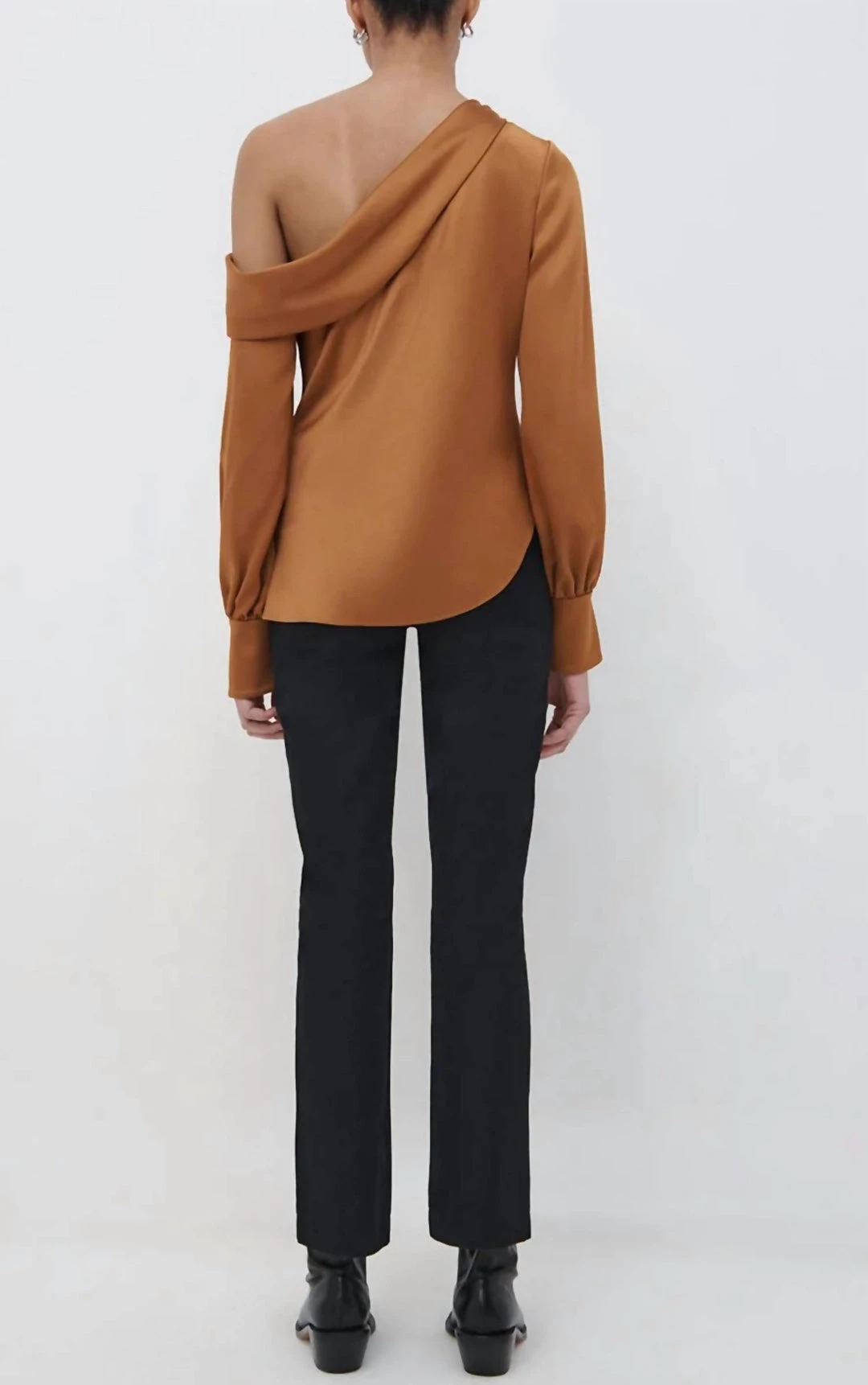 High sheen satin elegantly draped with romantic cold shoulder and buttoned cuffs. Dry clean only.