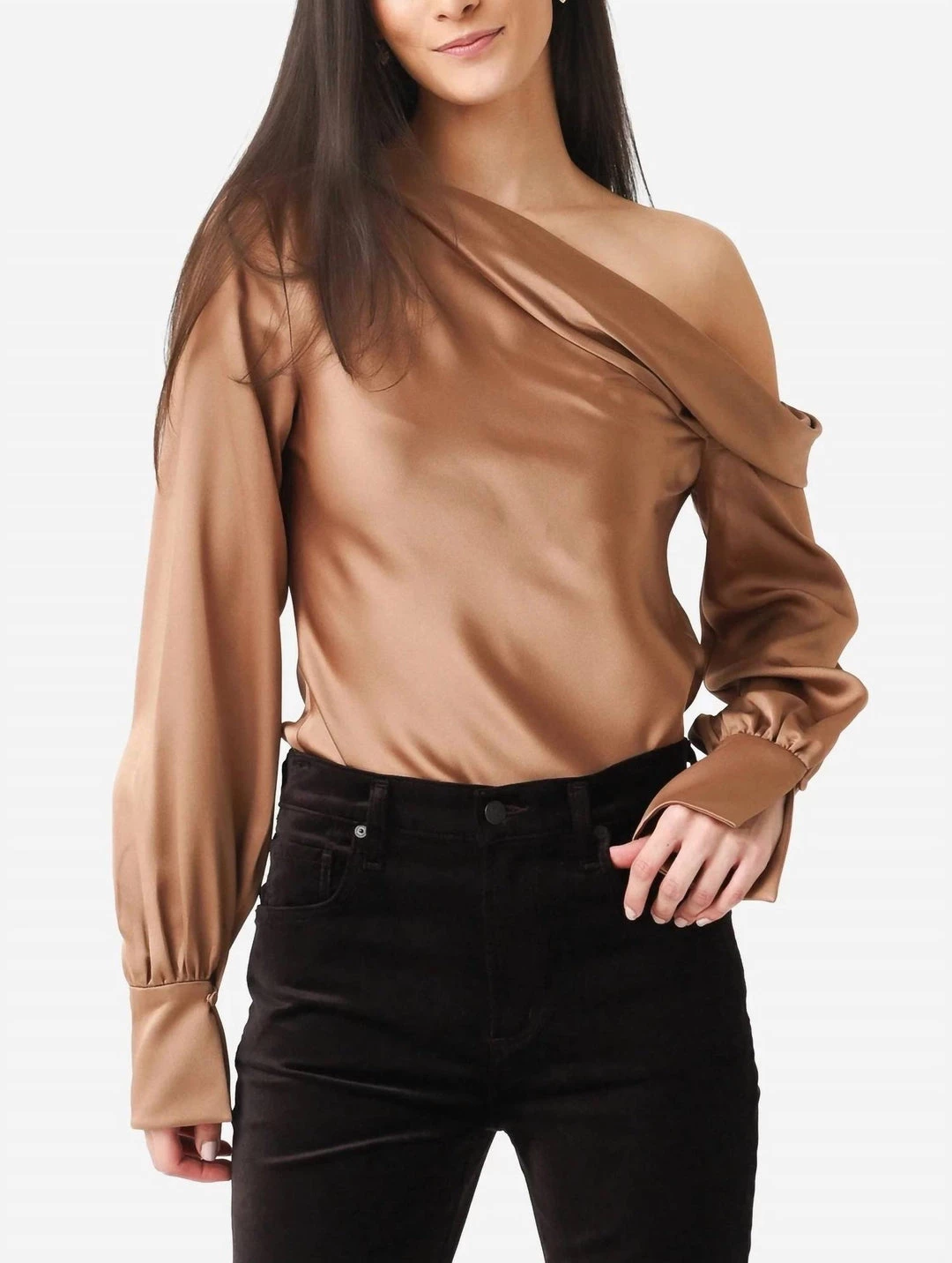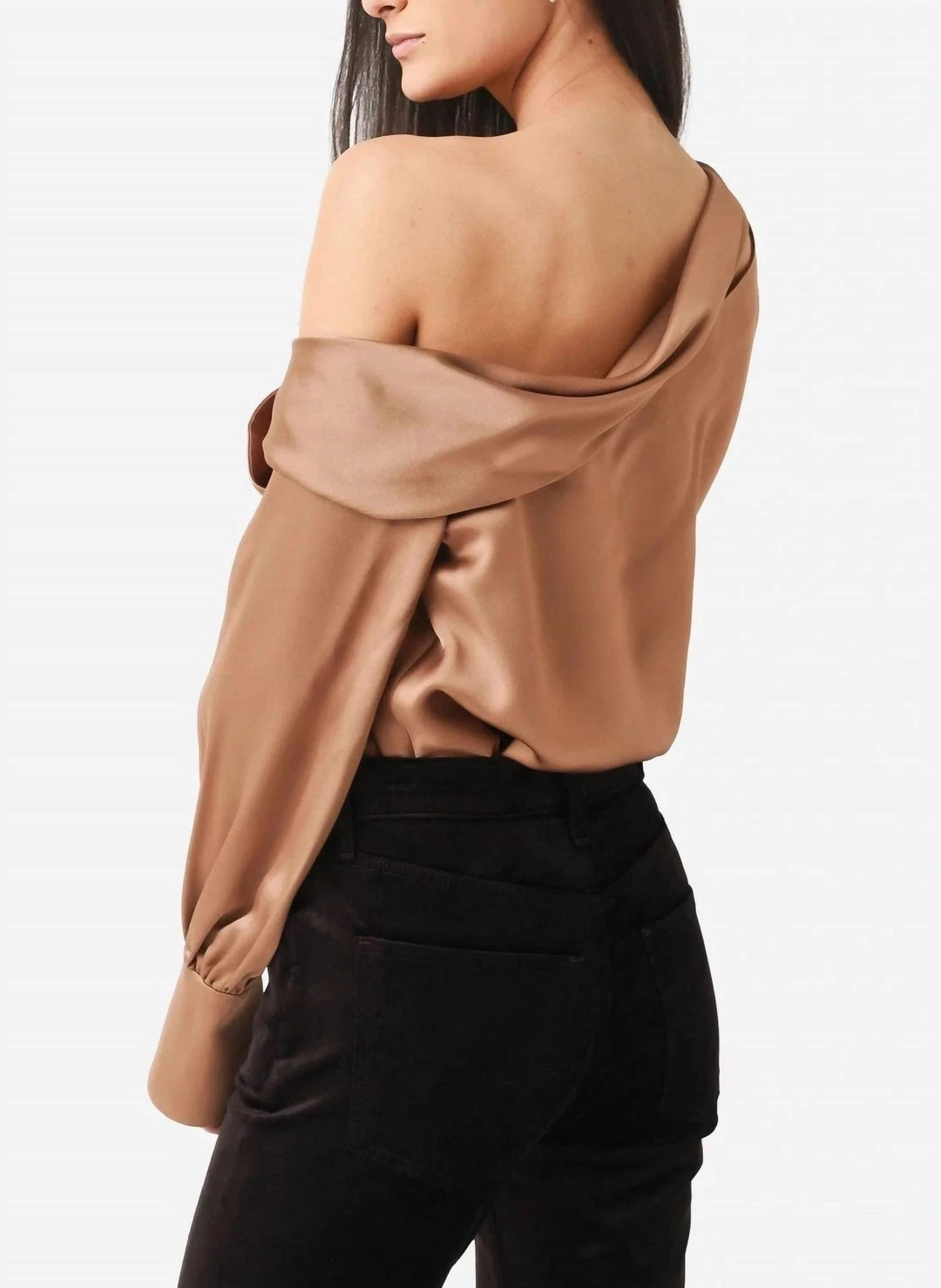 One Shoulder Neckline. Long Sleeve with Button Cuffs. Satin Fabrication. Draped Silhouette. Round Hem.