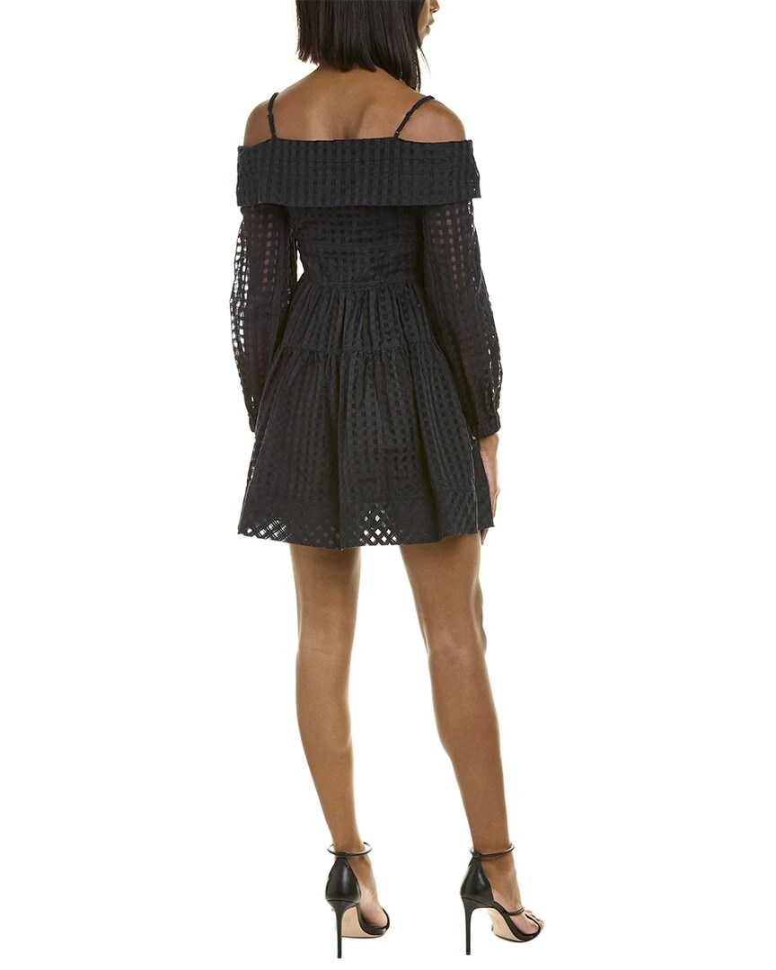 - Bahari Mini Dress In Black With Elasticized Adjustable Shoulder Straps, Burnout Windowpane Fabric, Fold-Over Neckline, Surplice Neckline With Self-Tie Detail, Off-The-Shoulder Sleeves With Elasticized Cuffs, Tiered Skirt And Dual Side Seam Pockets