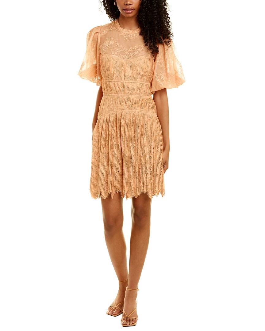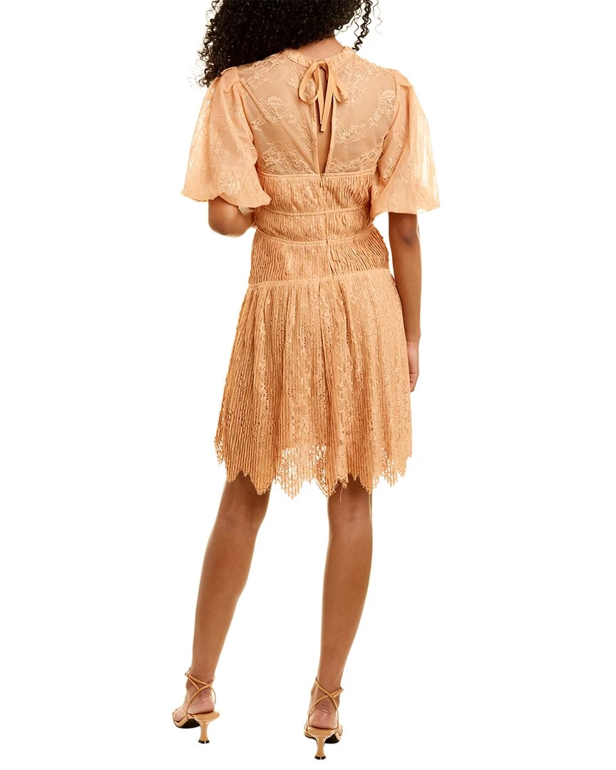 - Bristol Mini Dress In Butterscotch With Lace Design, Sheer Neckline, And Puffed Elbow Sleeves