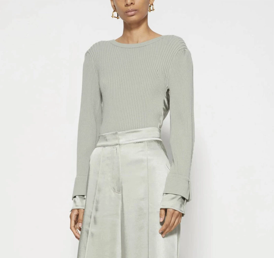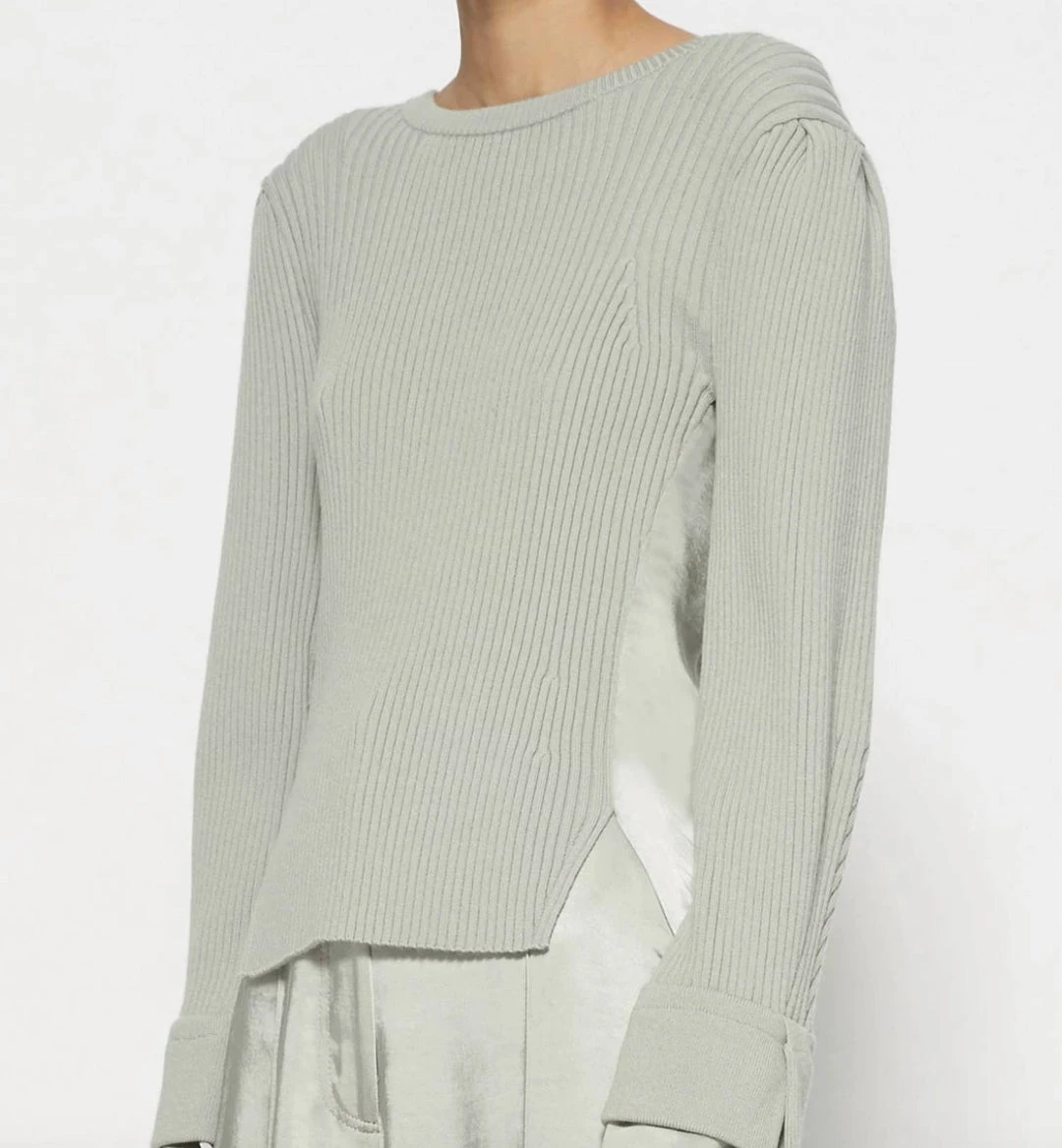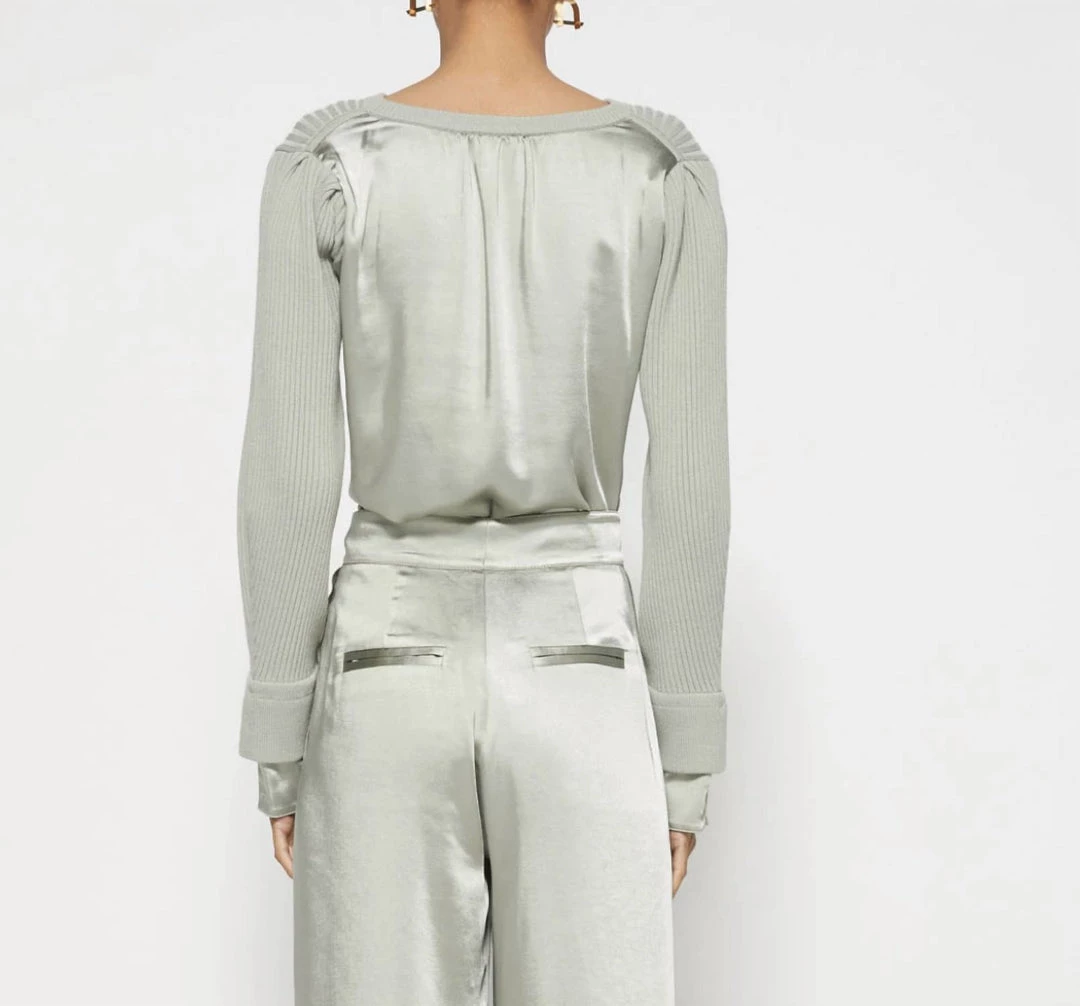 The Leia Leisure Dressing Pullover in Sage. Two tone, multi-textured top that matches a silky satin back panel with cozy wool knit blend front bodice and sleeves for a tonal play on texture.