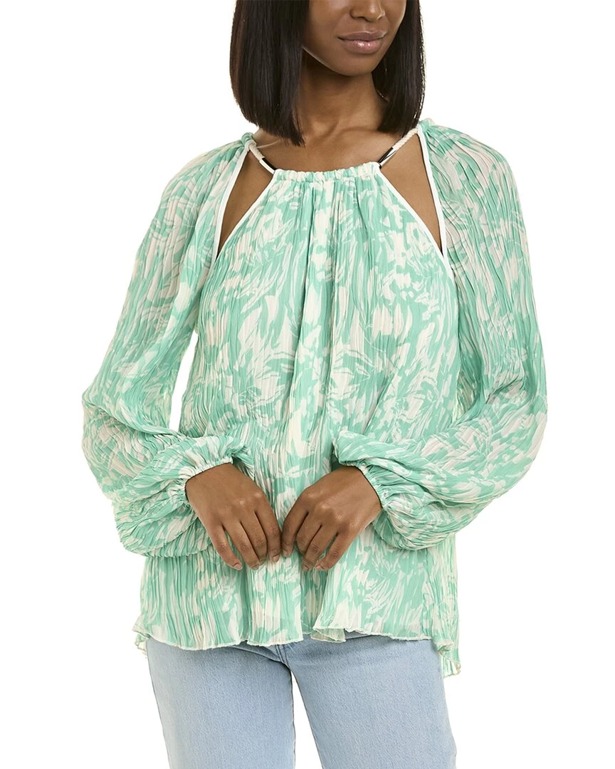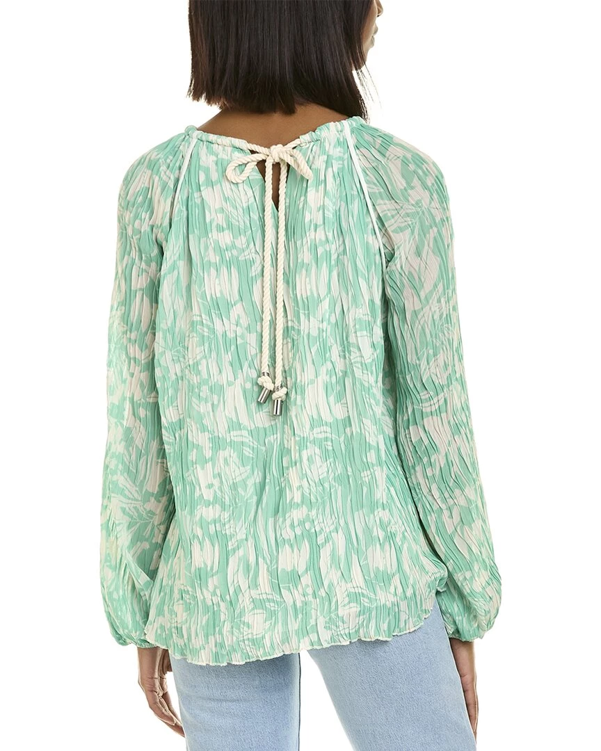 - Lilah Top In Kiwi Leafy Floral With Pleated Fabric, Cutout Neckline With Braided Rope And Bar Accents, Elasticized Cuffs And Lettuce Edge Hem