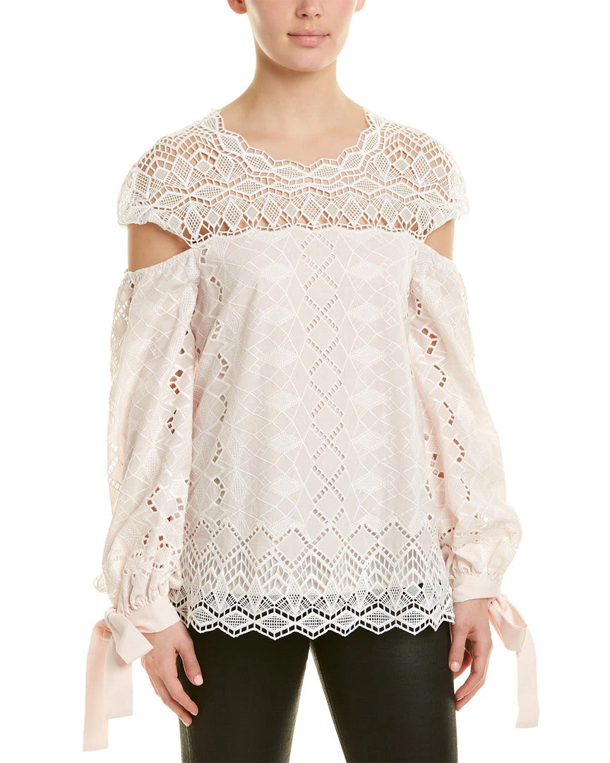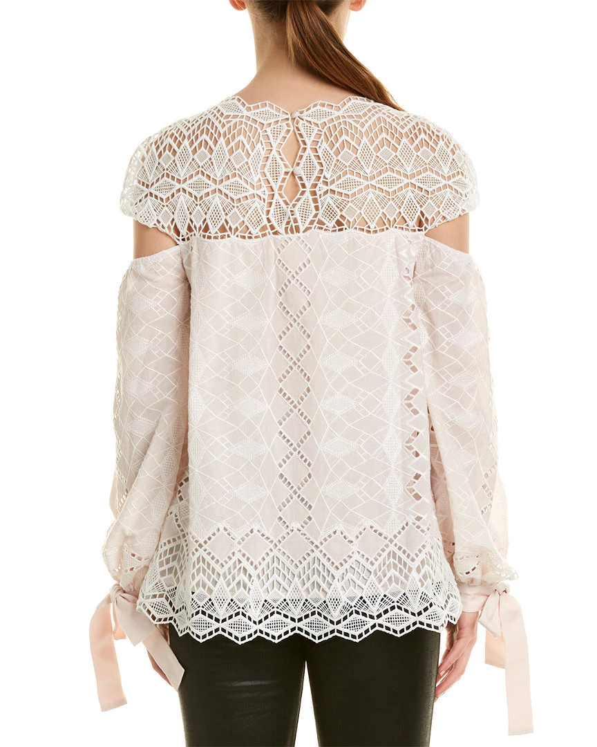 - Design Details – Sheer Lace Yoke And Hem, Cold-Shoulder Sleeves With Self-Tie Cuffs, Embroidered Detailing